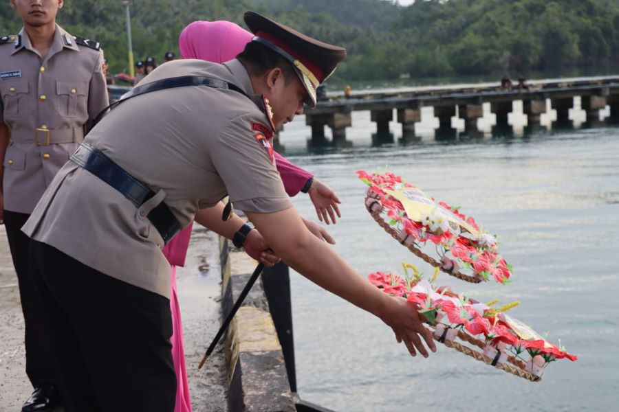 Kapolres Buol AKBP Handri Wira Suriyana Pimpin langsung upacara tabur bunga bertempat di Dermaga Pelabuhan Leok I, Kecamatan Biau