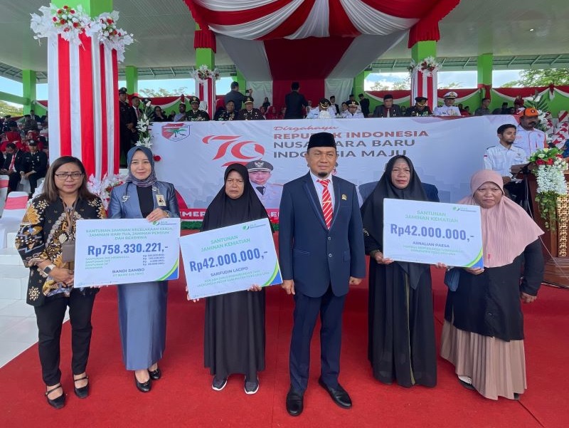 Kepala BPJamsostek Tojo Una-Una Ampana mendampingi Bupati Tojo Una-Una menyerahkan secara simbolis klaim Jaminan Kecelakaan Kerja Meninggal bagi Ahliwaris dari 1. Alm Bandi Sambo Karyawan BPD Sulteng Ampana sebesar Rp.758.330.221,-