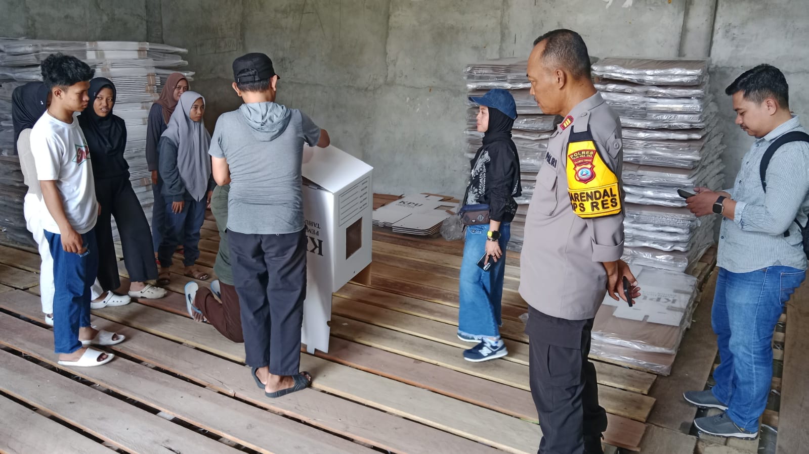 Karendalops AKP Kukuh Edi Purwanto didampingi Kasatgas Preemtif Iptu Aditya Meideski, S.T. hadir di gudang logistik KPU Touna dalam rangka melakukan pengawasan perakitan kotak suara pemilihan serentak Tahun 2024.