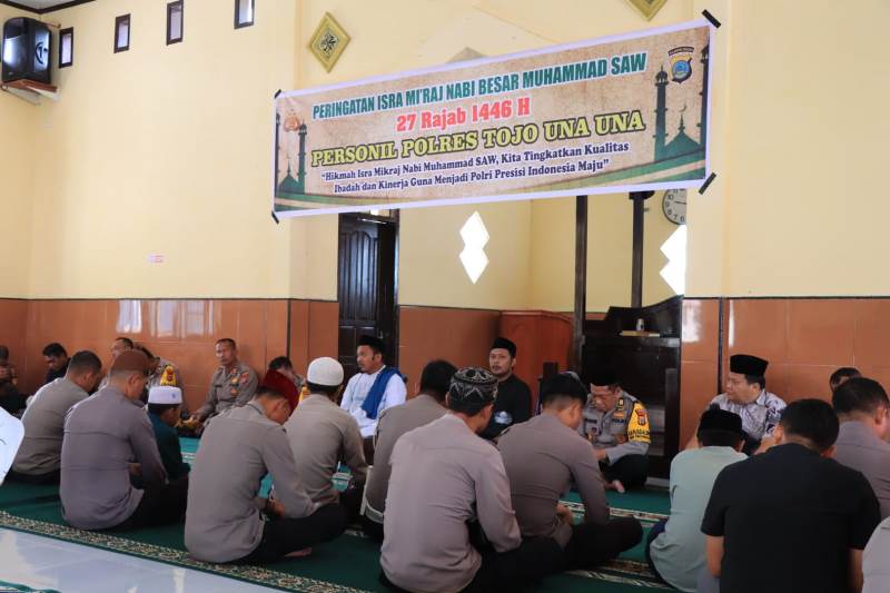 TOUNA – Polres Tojo Una Una menggelar acara peringatan Isra Mi’raj Nabi Besar Muhammad SAW Tahun 1446 H / 2025 M di Masjid Al-Muhajirin Polres Tojo Una Una, Selasa (27/01/2025).