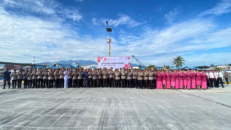 Upacara tabur bunga ini turut dihadiri oleh Wakapolres Touna, para Pejabat Utama (PJU) Polres Touna, serta dari komandan Lanal, dan Sabandar Ampana, menunjukkan sinergi dan soliditas antara institusi penegak hukum dan elemen maritim di wilayah Touna.