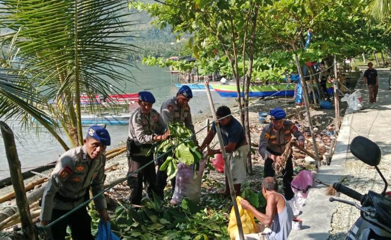 Kasatpolairud Polres Touna, IPTU Sodang Satuan, S.H., memimpin langsung 7 personel Satpolairud melakukan bersih-bersih pantai bersama warga Dusun 5, Desa Uebone, Kecamatan Ampana Tete.